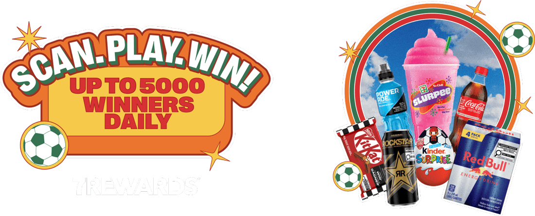 †No purchase necessary.Valid 4/29/26 11:59pm PT – 6/23/26 11:59pm PT. Residents of BC, AB, SK, MB, ON, 13 years+. Scan 7-Eleven app bar code for one valid entry and one in-app game play, plus earn bonus entries with participating products, includes 7Now delivery orders and Mobile Checkout. Up to 5000 reward prizes awarded daily, plus one grand prize for $10,000. Maximum (10) game plays / per day in app. Odds depend on total entries and eligible gameplays received for date/time of play. Download 7-Eleven or 7Now app. Full contest rules and no purchase option at 7rewards.ca.