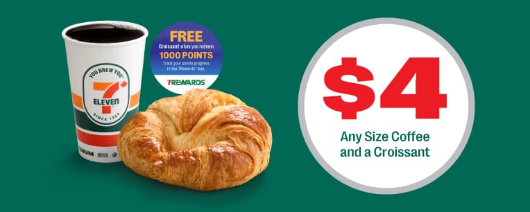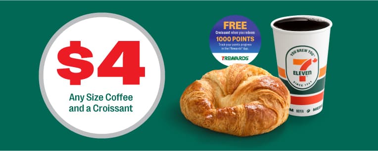 Start your morning with freshly brewed coffee and a baked in-store croissant for only $4! 7Rewards Members only.